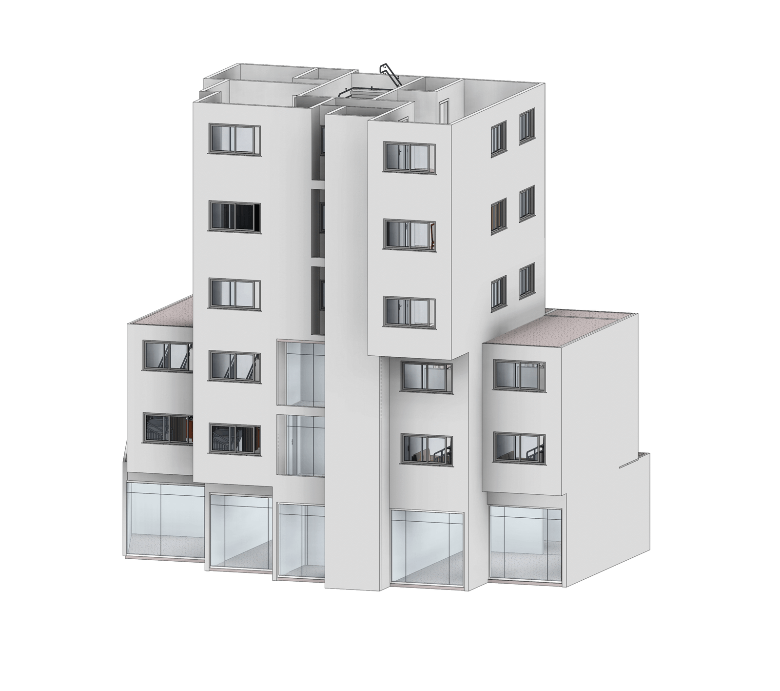 Modelagem de Alta Fidelidade: O projeto foi minuciosamente reconstruído no Revit, replicando a arquitetura concebida em CAD com precisão para cada pavimento – do térreo comercial, passando pelo mezanino residencial, até os andares superiores de moradias.