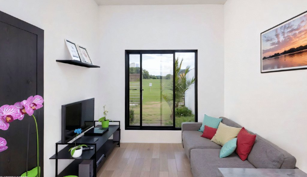 - Otimização e Ampliação de Espaço: Um dos grandes trunfos do projeto foi a otimização da planta interna. Conseguimos adaptar, de forma ergonômica e dentro dos limites do terreno, a inclusão de três quartos, sendo uma suíte, além de uma área de churrasqueira externa e uma lavanderia externa. Para ampliar a sensação de grandiosidade e conforto, o pé-direito da sala de estar e de jantar foi significativamente aumentado, criando ambientes mais arejados e convidativos.