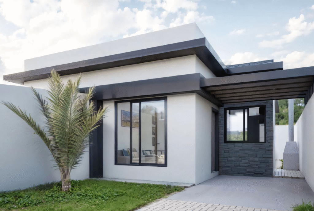 - Cores e Materiais: O estudo do entorno e do produto indicou que uma paleta de cores neutras seria a mais valorizada para um projeto de venda. Por isso, cores como branco, cinza e preto foram escolhidas como a paleta principal da fachada, conferindo um visual moderno, elegante e atemporal, capaz de agradar a um vasto público.